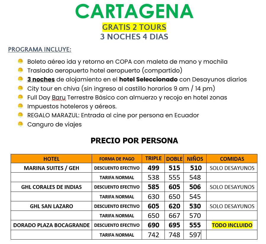 MARAZUL Agencia de Viajes cumple con la ley de protección al consumidor que obliga a dar al cliente PRECIOS TOTALES FINALES, es por eso que nuestras tarifas no tienen letras pequeñas ni impuestos adicionales, Tasas de aeropuertos, IVA o cargos aparte para mejor servicio y sinceridad al consumidor.