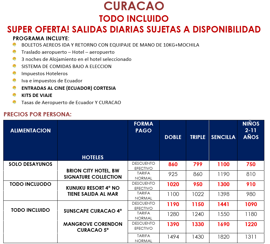 Por normas internacionales el Check-in u hora de entrada a los hoteles es a las 15h00 y check-out o salida es a las 12h00 medio día. Fuera de estos horarios se generan cargos adicionales pagaderos por el pasajero en el destino.