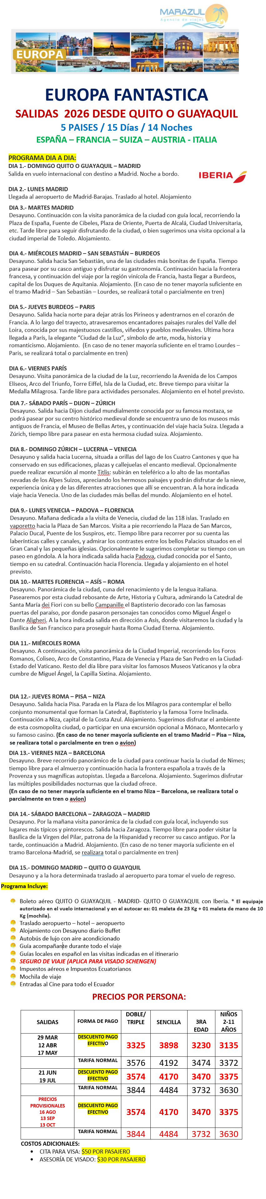 MARAZUL Agencia de Viajes cumple con la ley de protección al consumidor que obliga a dar al cliente PRECIOS TOTALES FINALES, es por eso que nuestras tarifas no tienen letras pequeñas ni impuestos adicionales, Tasas de aeropuertos, IVA o cargos aparte para mejor servicio y sinceridad al consumidor.