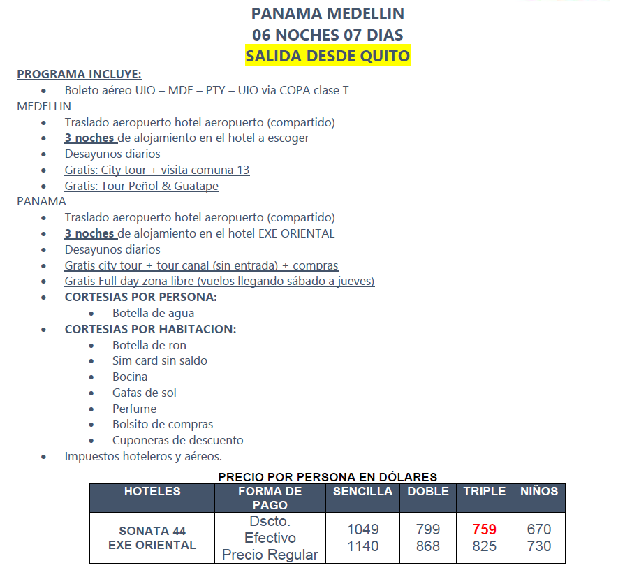 Por normas internacionales el Check-in u hora de entrada a los hoteles es a las 15h00 y check-out o salida es a las 12h00 medio día. Fuera de estos horarios se generan cargos adicionales pagaderos por el pasajero en el destino.
